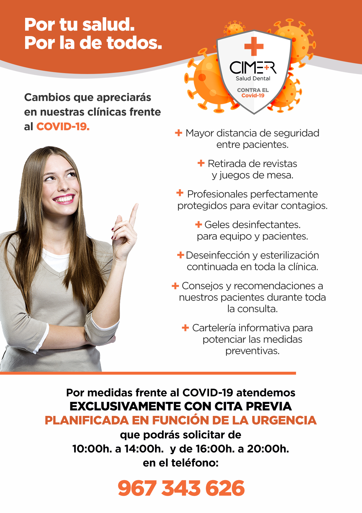 Tu clínica dental CIMER Almansa vuelve a abrir sus puertas para atender a los pacientes con CITA PREVIA, siguiendo todos los protocolos de seguridad e higiene recomendados por las autoridades sanitarias.